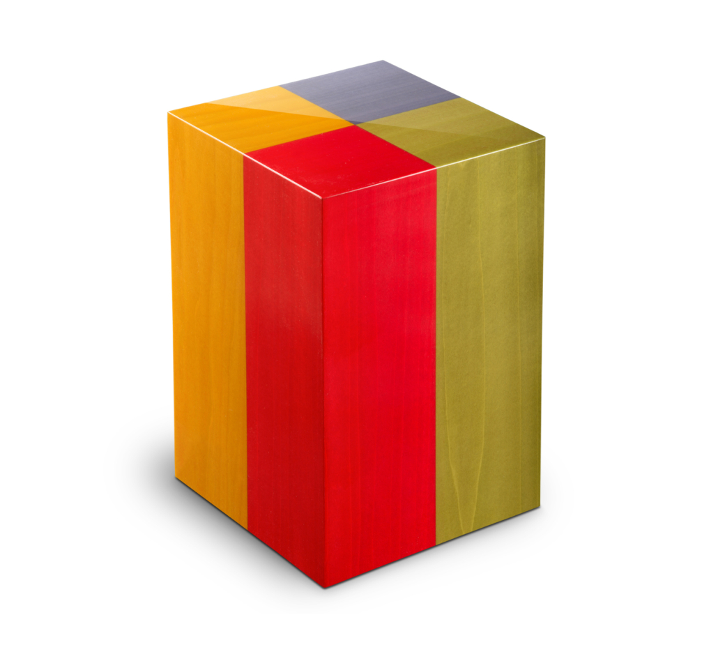 Die Urne trägt die vier typischen Farben des italienischen Harlekins. Die verwendetetn Hölzer sind Eukalyptos und die Hölzer Pama, Lolo und Yata.