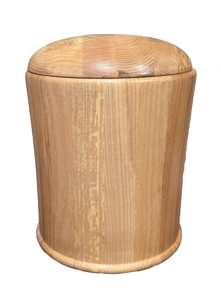 Schlichte Holzurne. Die Urne hat einen Durchmesser von 21 cm und ist 27 cm hoch.