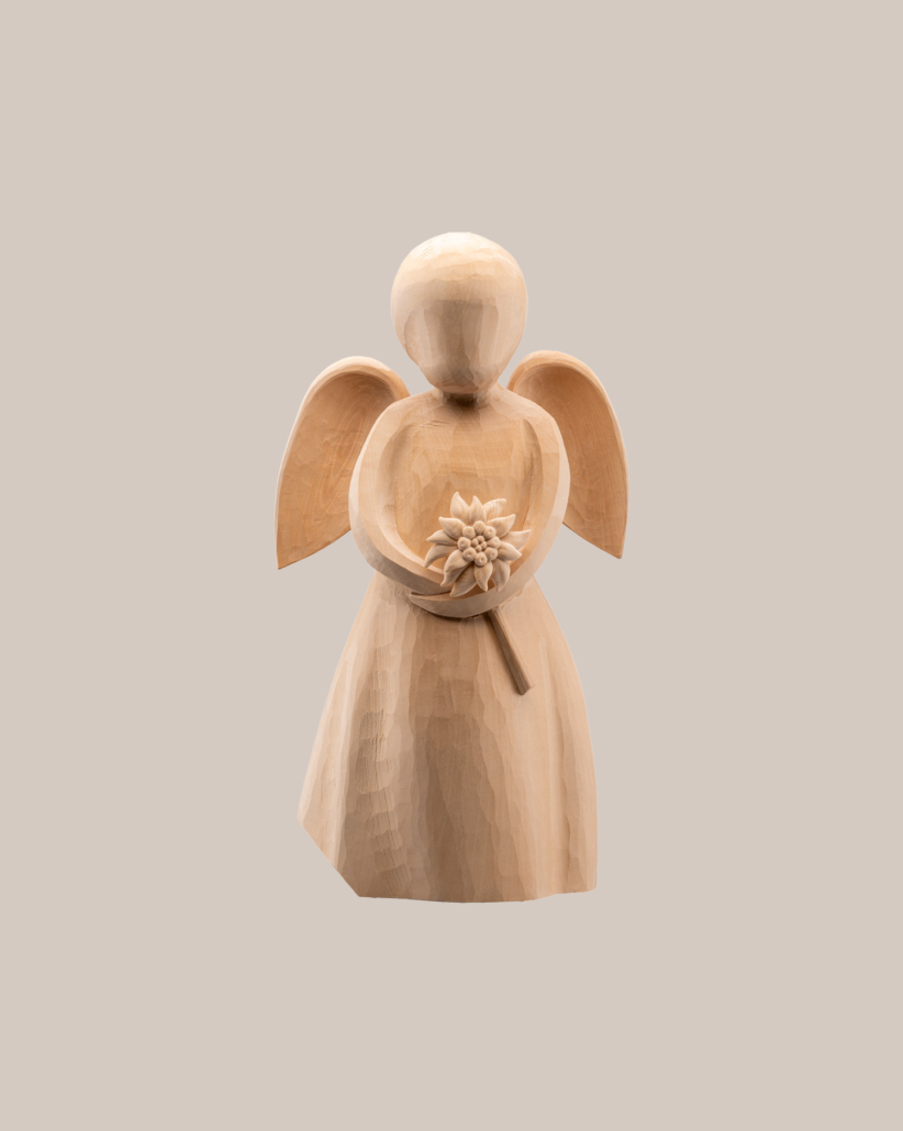 Wunderbarer Holzengel eine Edelweißblüte tragend. Dieser wunderbare Engel aus Lindenholz ist stattliche 50 cm hoch.