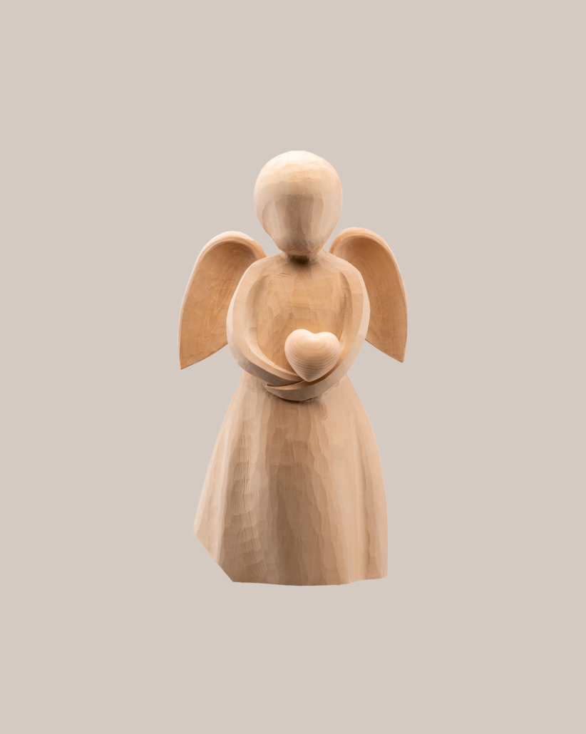 Holzengel-Urne mit Herz.