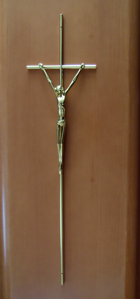 Schlankes Kruzifix aus Messingstäben mit gegossener Christus-Figur.